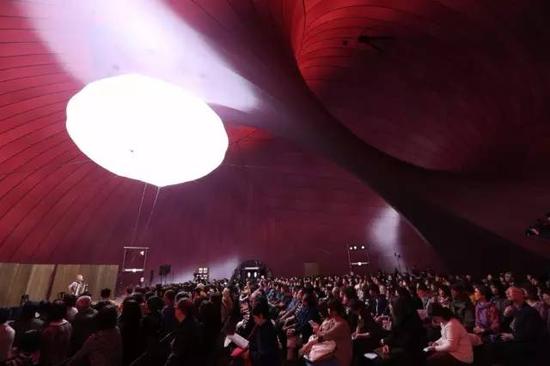当夜幕四合,这个卧着的庞然大物散发着红色柔光,整个世界都静下来了,音乐厅的结构线丝丝入扣,像一枚孕育的蚕蛹。当音乐响起的时候,人们从中感受到生活的美好。