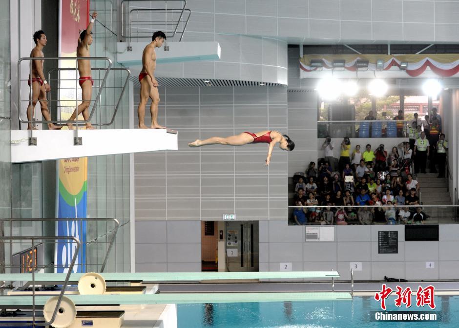 8月28日上午,内地精英运动员在香港表演花式跳水。当天,里约奥运内地精英运动员代表团继续访港行程,与市民交流,部分运动员到维多利亚公园(维园)游泳池示范跳水。 中新社记者 谭达明(香港分社) 摄