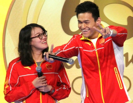 图为游泳运动员孙杨(右)在伊利沙伯体育馆“奥运精英约定你”汇演中,模仿队友傅园慧的表情和手势。(8月28日摄)