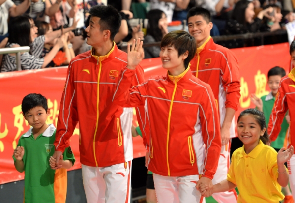 图为羽毛球运动员谌龙(前排左二)、乒乓球运动员丁宁(前排右二)等牵着香港小朋友的手进入伊利沙伯体育馆,与现场观众进行互动。(8月28日摄)