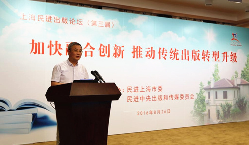 8月26日,由民进上海市委会、民进中央出版和传媒委员会主办,民进上海市文化出版传媒委员会承办的第三届“上海民进出版论坛”在上海市政协会议厅举行。出版论坛主题为“加快融合创新,推动传统出版转型升级”。民进中央副主席、上海市人大常委会副主任、民进上海市委会主委蔡达峰,上海市新闻出版局副局长蔡纪万出席并讲话。