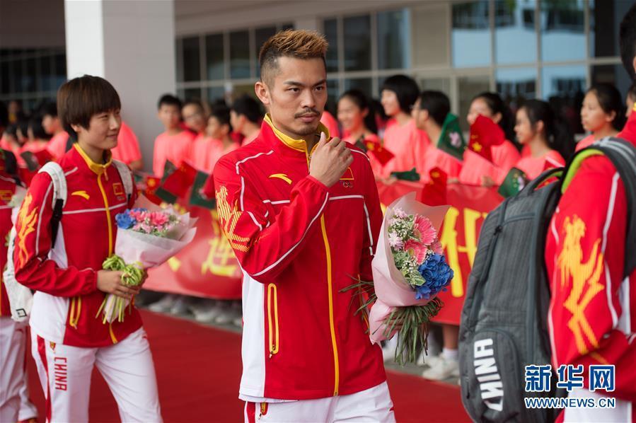 8月29日,羽毛球运动员林丹(中)抵达澳门外港码头。 新华社记者 张金加 摄
