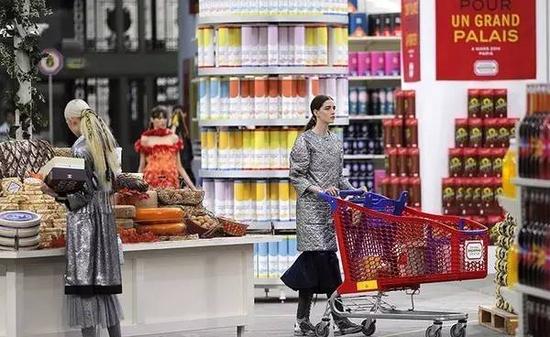 令人印象最深刻的还是Karl Lagerfeld在14年上演的Chanel超市秀,令人们心中的高级时装如此接地气。一般观众往往会赞叹老佛爷就是位老顽童总会不按理出牌。