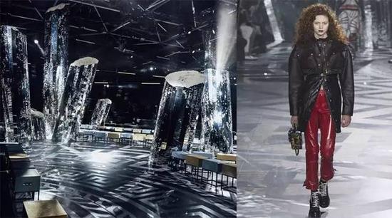 巴黎时装周上Louis Vuitton 一如既往在基金会博物馆大楼里发布新系列。他们在 Frank Gehry 设计的方形帆船博物馆旁搭了金字塔和半球形两个临时空间,几何形体的秀场极具未来感——像一块探索未来和宇宙的基地。秀场内部是一个由破碎的镜子所组成的城市,像一片未来高科技的废墟或是亚特兰提斯城沉到海底的一座失落的未来城市。我们仿佛进入了发现未来的考古之旅。这季秀场由设计师和Justin Morin合作,秀场内部以奇怪的角度耸立的五十多根柱子几乎照搬了Justin Morin的《融化之骨》。艺术家深受极简、光与空间运动以及欧普艺术影响。有趣的是艺术家的工作范围一直都是处于艺术与时尚这两个世界之间的边界。Justin Morin明确地表示,这两个不同的世界从没相撞在一起,直到:艺术家将艺术界与时尚界这两种美丽行业的本质功能呈现出来。无论如何,现场200000块半破碎的镜子和35吨染色沙石的制作,让我们不得不承认——虽然秀场传达的概念离谱,但是我们很享受……