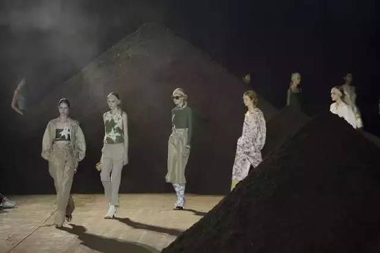 Phillip Lim的金字塔土堆融合和过去和未来,带有强烈的原始未来主义的气息。他这样解释说:“我在想一切事物的起源在哪儿?应是从种子开始,从泥土开始的”。秀场布景采用锥形土堆,金字塔般的造型通过象征主义引发人们关于过去与未来的思考。这让人想起艺术家Wolfgang Laib(沃尔夫冈?莱普)讲述他的创作时,说:“花粉是植物生命的潜在开端。它是如此简单,如此美丽又如此复杂?!盤hillip Lim秀场对朴实的泥土地的使用,非常像Wolfgang Laib的创作观念。