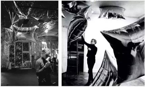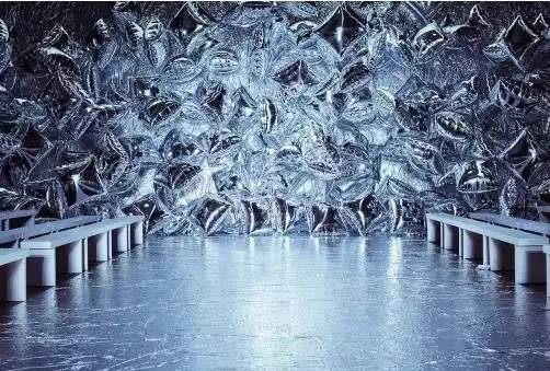 Andy Warhol的装置“Silver Clouds”在纽约一家画廊里展出。那是1966年,他在展览现场制作了许多气球,它们随着空气流动在展厅中漂浮、相互碰撞,气球闪耀着银色光芒,整个氛围空灵又愉悦,观众置身其中并且触手可及。Mary Katrantzou秀场灵感来就自该现场,他们在今年的秀场上使用无数只银色锡箔包裹的气球打造了一个易碎的未来梦幻天堂。