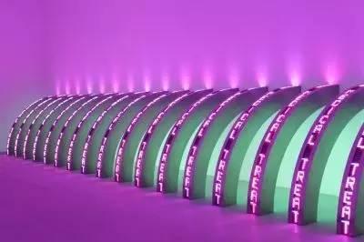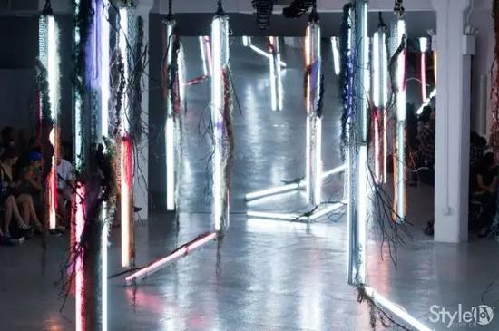 Rodarte(罗达特) 时装品牌,由来自美国加州的设计师凯特·穆里维 (Kate Mulleavy) 和劳拉·穆里维 (Laura Mulleavy) 姐妹创建。秀场让人想起Francois Morellet(弗朗索瓦·莫尔莱),一位出生于1926年的法国的超现实主义艺术家。他常用利用光线与几何的组合,来营造出神奇的视觉效果。作品主要由各种颜色和造型的霓虹灯组成,看似简单的布置与空间结合后却能带来不一样的效果。极简主义大批地影响各品牌,如Givenchy、Proenza Schouler等。这是时代的塑造的力量……