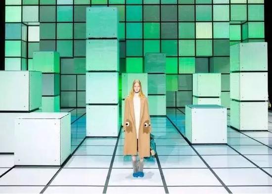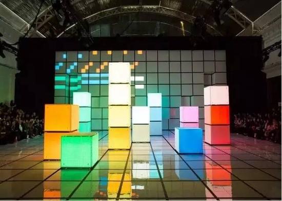 设计师Stuart Nunn用既能发光也能接受光的LED像素板创建了一个多彩的秀场布景。他以像素为灵感,并告诉我们T台其实是一个巨大的游戏机内部。那些方块其实就是像素,模特走秀就是玩一场经典像素游戏。这让人想起日本艺术家Tatsuo Miyajima在1987年发现的发光二极管,即LED,他用这种简单的媒介围绕着探讨生命、死亡、时间等抽象而迷离的话题进行创作。秀场的色彩不一的像素格子使人想起Tatsuo Miyajima霓虹装置上的数字,这些数字来自几个普通人的生日,艺术家在这里结合大众的用意似乎和秀场的设计观念是一样的,但秀场把这观念似乎运用得活色生鲜——这种观念似乎已经融入设计师大脑,并在秀场大玩起来。这次,似乎时尚要赢得一分,在艺术面前,时尚作为仰望者,败也败在这儿,赢也赢在这儿……双赢也许来自更深的平衡。