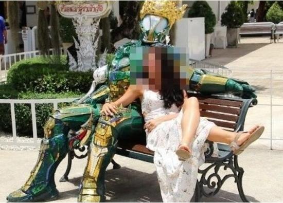 这些游客在寺庙椅子上跟雕塑合照时,喜欢搂抱、亲吻及用手抓它,导致雕塑严重受损,有西方游客甚至用脚指着雕塑让朋友看。