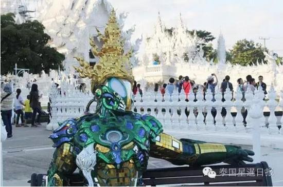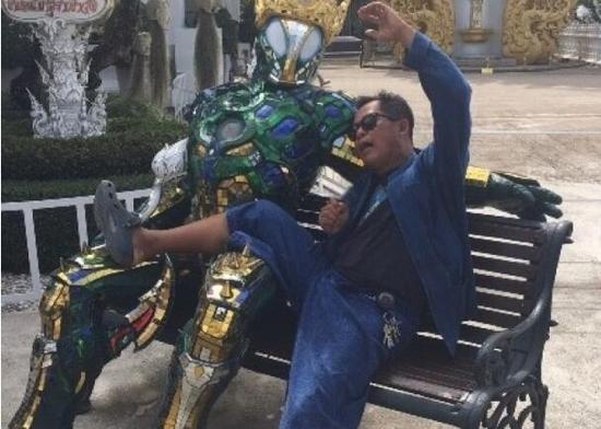 该坐在长椅上的雕塑是去年制作完成的,外观所用的材料是一些瓷砖和玻璃,小片小片的粘起来,头上还戴上了有泰国特色的头冠,手上拿着莲花,然而被欧美游客的大肆踩踏、拥抱,“钢铁侠”大腿上的玻璃片已经开始掉落。