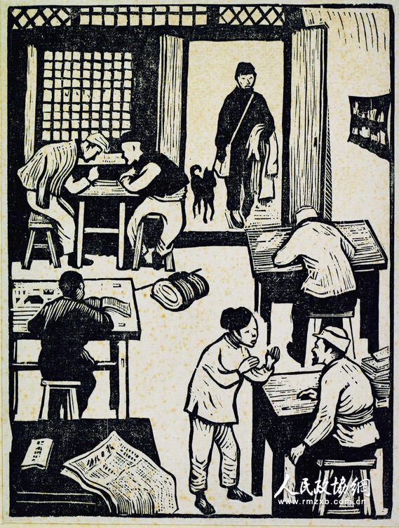 “见到一个农民把收获的粮食倒进仓里,我即时想到:‘这可不是地主的粮仓。’于是创作了一幅木刻《入仓》;见到区政府的办公室,虽然是一间简陋的房子,但它是劳动人民当家做主自己的政府??!于是创作了《区政府办公室》?!?/p>