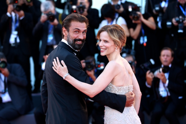 8月31日,在意大利威尼斯,第73届威尼斯电影节开幕式主持人索尼娅·贝尔加马斯科(右)和意大利演员法布里齐奥·吉富尼亮相开幕式红毯。