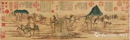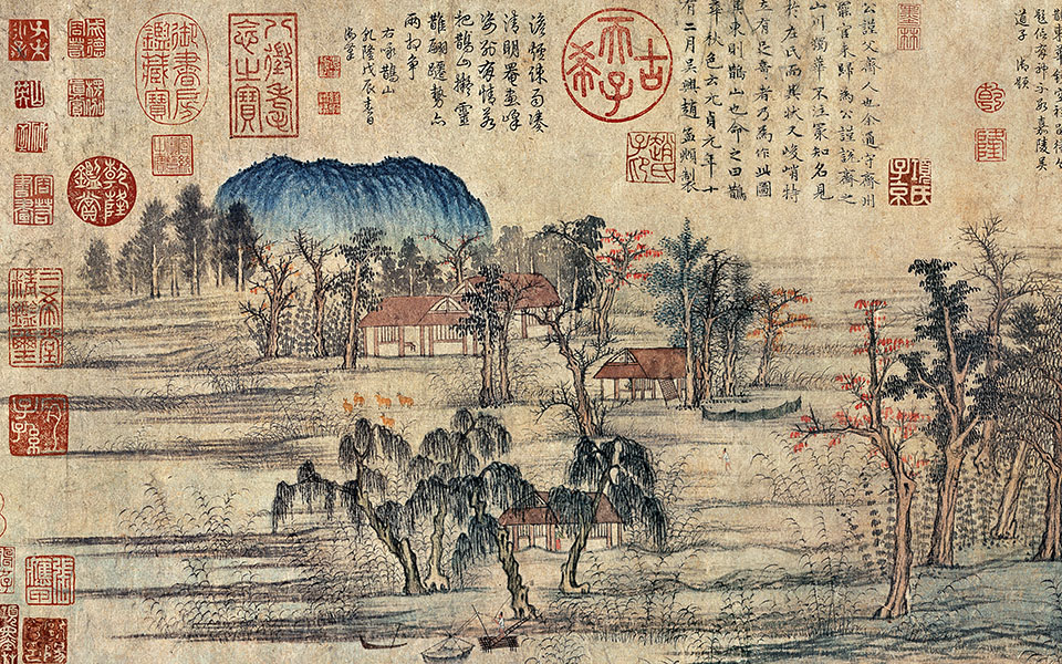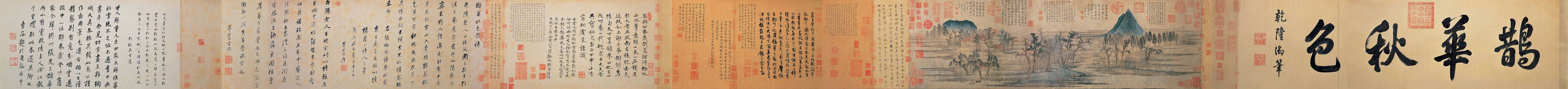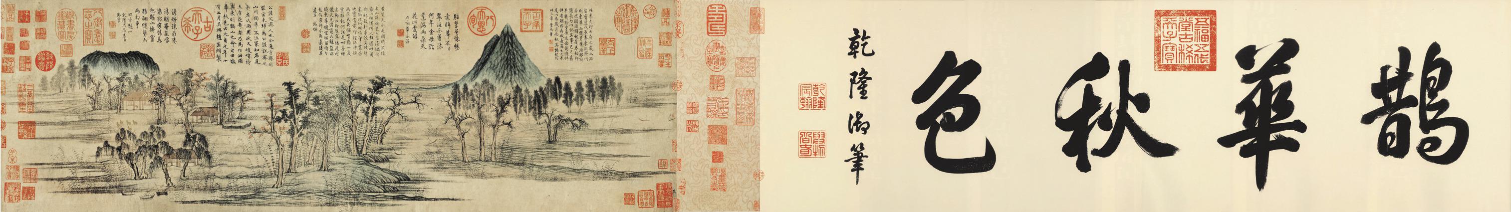 《鹊华秋色图》不愧是一幅名画:长汀层迭,渔舟出没,林木村舍掩映,平原上两山突起;林木红绿相间,枯润相杂,树姿高低变化丰富,疏朗有致;房舍人畜、芦荻舟网均精描细点,诸多景物安排错落有致。这幅图在元、明两朝一直收藏于民间,到了清朝,被收入皇宫,成了乾隆皇帝心爱的宝贝,乾隆亲笔以大字“鹊华秋色”题于引首,题跋九则,钤印众多。