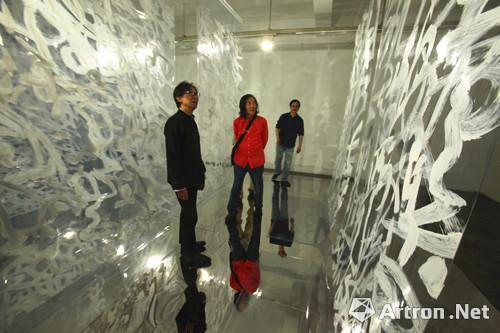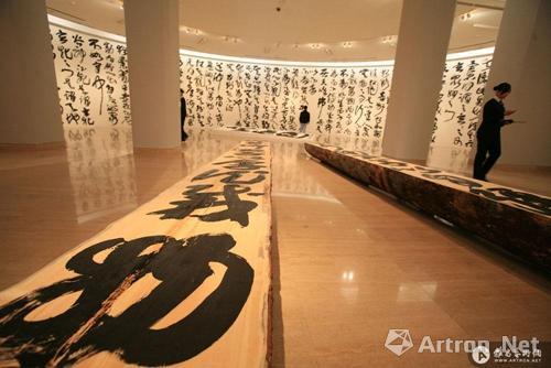 “传统书法没有这么大,从观念来讲,巨幅狂草实际上是一种公共艺术,也是一种行为艺术。它与当时的生活是有关联的,比如手卷,更符合古代人的习惯。而巨幅书法常常呈现在大的空间内,观众走着走着就走进去了,就是一种很现代的方式?!蓖ü醵湮毡试谥矫嫔匣ぷ?,观众在现场感知到的视觉、空间与氛围都是一种运动的节奏,并使得这些文字符号创作有了自身的意义传达。