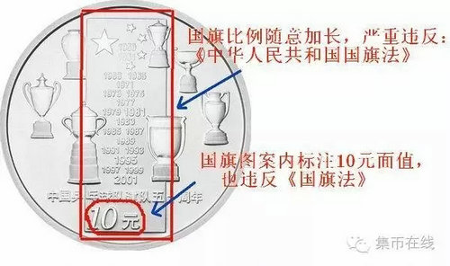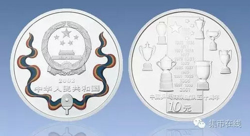 品种四:2002年发行的“乒乓球建队50周年”彩银币。错版情况:这枚局部彩色银币,在国旗和国徽上都没用国家规定的色彩,而在彩带上用了彩色;而在国旗上隽刻了各类年号数字,违反了国家对国旗和国徽的有关规定。