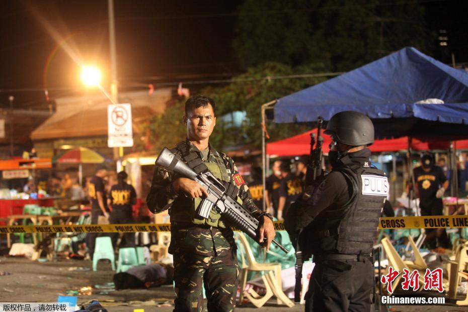 当地时间9月2日,菲律宾南部重镇达沃市一夜市发生爆炸事件,至少已造成10人死亡、60人受伤。图为菲律宾警方在事发现场。