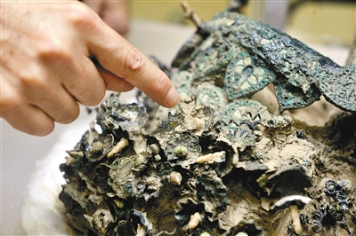 根据现场清理的情况看,在棺椁旁当初盛放礼冠的盒子后来倾斜了,加上填土原因,盒子可能破碎了,因此发掘时这个盒子已经呈完全坍塌腐朽状,考古专家在现场只发现了盒子的铜包角,上面有铜钉和漆皮,以及盒子上的银合页。变形的礼冠与盒子以及周围的一些陪葬品混在一起难辨原委。