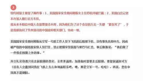《纽约时报》还说,美国总统国家安全事务助理苏珊·赖斯,也被同一名中国安保人员阻拦,她因此看上去既困惑又愤怒。