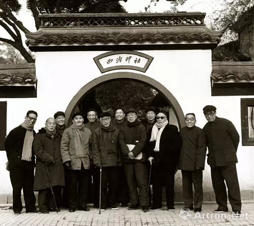 前排右起:程十发、钱君匋、谢稚柳、沙孟海、王个簃、朱复戡、诸乐三、周哲文;
