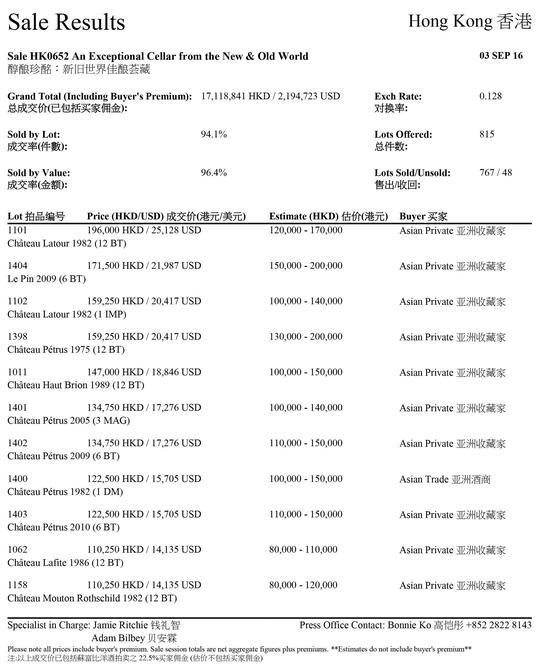 苏富比亚洲区洋酒部主管贝安霖(Adam Bilbey)表示:“我们很高兴看见亚洲藏家于拍卖现场及网上竞投一系列来自新世界与旧世界之顶级美酒。亚洲藏家对成熟的波尔多佳酿尤为追捧,再次证明资深藏家对此优质葡萄酒产地趋之若鹜。另值得一提的是,新世界佳酿亦成绩斐然,尤其是顶级酒庄如Harlan Estate及Dominus。”