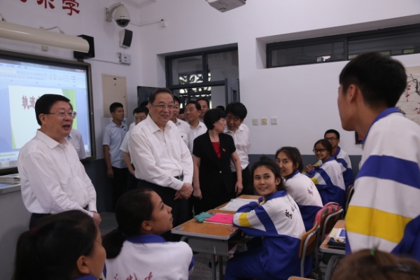9月5日至6日,中共中央政治局常委、全国政协主席俞正声在天津调研。这是9月5日,俞正声来到崇化中学看望内地新疆高中班学生。新华社记者 刘卫兵 摄