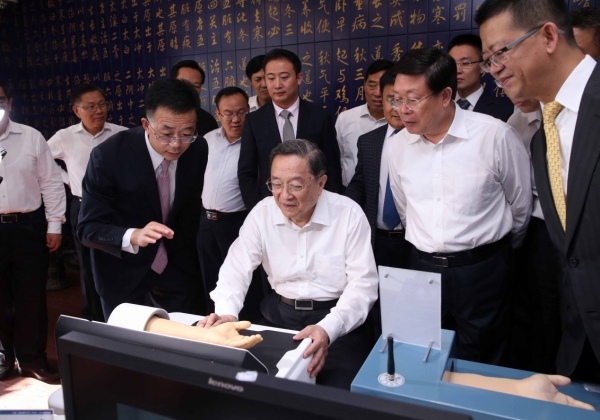 9月5日至6日,中共中央政治局常委、全国政协主席俞正声在天津调研。这是9月5日,俞正声在天堰医教科技发展有限公司了解企业产品研发等情况。新华社记者 刘卫兵 摄