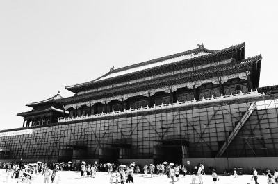 近日,故宫博物院对午门城楼由于雨水渗漏多处抹灰脱落的墙面进行修缮。施工人员选择游人较少的时间或者闭馆时进行作业,最大限度地避免影响游客参观。特约摄影 孙山