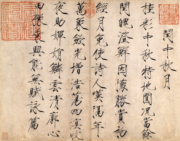 《闰中秋月帖》钤“御书”“宣和殿宝”“宋華审定”“嘉庆御览之宝”等印。虽然没有赵佶的名款,但用笔沉稳流畅,结字方整平和,具有瘦金体典型风格。另外,此帖曾经清代著名诗人、文物收藏家宋荦审定,亦曾入清宫收藏,经乾隆内府、嘉庆内府等收藏,《石渠宝笈初编》著录。