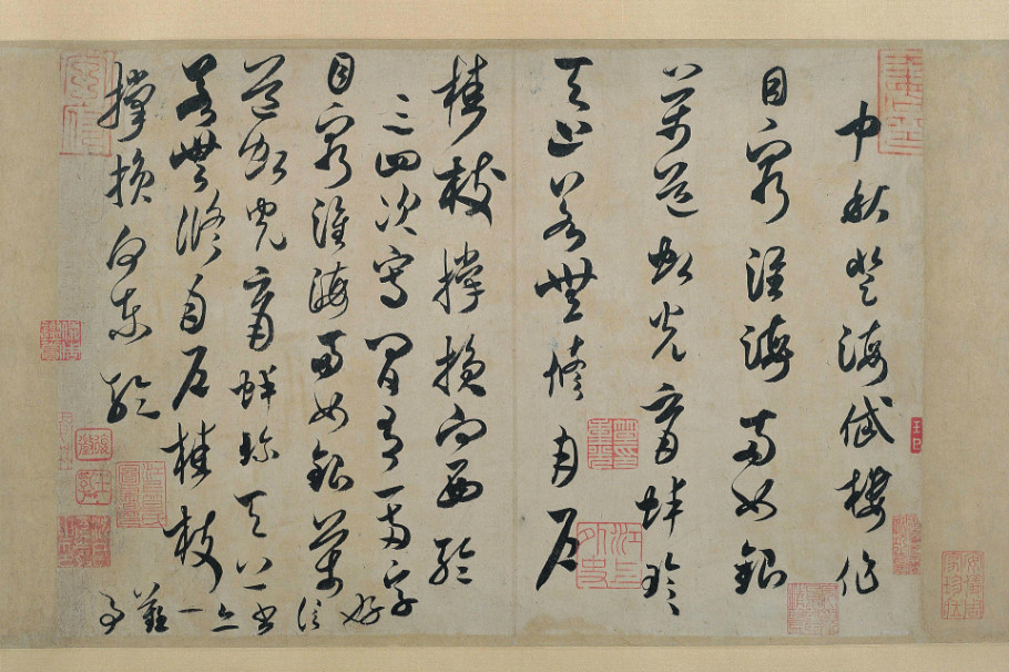 与中秋相关的法帖,还有一幅收藏于日本大阪市立美术馆的《中秋登海岱楼诗帖》,为宋代书法家、鉴藏家、收藏家米芾所作:“目穷淮海两如银,万道虹光育蚌珍,天上若无修月户,桂枝撑损向西轮。目穷淮海两如银,万道虹光育蚌珍,天上若无修月户,桂枝撑损向东轮?!?/p>