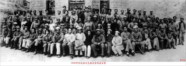 1942年,整风运动逐渐在延安各单位展开。而这时的延安文艺界出现了“暴露黑暗”等问题。毛泽东感到有必要解决这些问题,通过文艺界的整风,澄清一些是非。为此,他做了大量的调查研究工作。4月间,毛泽东约请艾青、刘白羽等几十位文艺界人士谈心。通过交谈,毛泽东对中国革命文艺的方向、道路和未来,有了完整的构想。5月2日下午1时半,延安文艺座谈会第一次会议召开。会场气氛十分活跃,大家争相发言。5月16日召开了第二次全体会议。5月23日下午召开最后一次会议。在朱德讲话后,毛泽东作总结讲话。由于听报告的人越聚越多,室内十分拥挤,便将会场移到室外广场,临时用三根木椽支个架子,吊上一盏汽灯。报告结束时,已是深夜。毛泽东的总结讲话,阐明了革命文艺为人民群众、首先是为工农兵服务的根本方向,系统地回答了文艺运动中许多有争论的问题,强调革命文艺工作者必须从根本上解决立场、态度的问题。