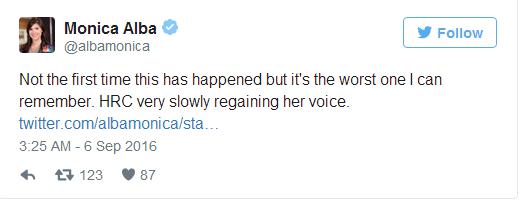 美国NBC电视台的记者Monica Alba对此评论称,“这不是希拉里第一次在演讲中咳嗽,但是,这是我记忆中最严重的一次?!?/p>