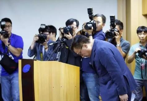 三星电子移动业务总裁鞠躬道歉。