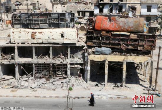 资料图:空袭过后的叙利亚城市居民区。