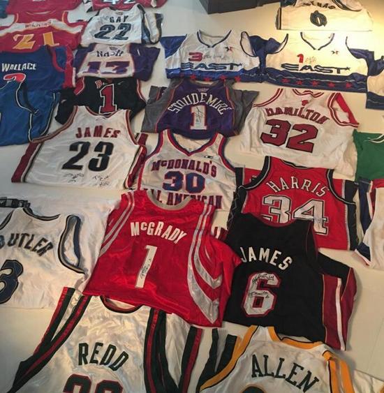 从汉密尔顿晒出的这张照片里可以看到他收藏的有多米尼克-威尔金斯的老鹰球衣、鲁迪-盖伊的灰熊球衣、本-华莱士的活塞球衣、德里克-罗斯的公牛球衣、勒布 朗-詹姆斯的骑士球衣、特雷西-麦克格雷迪的火箭球衣、卡隆-巴特勒的奇才球衣、雷-阿伦的超音速球衣、詹姆斯的热火球衣和迈克尔-里德的雄鹿球衣等。