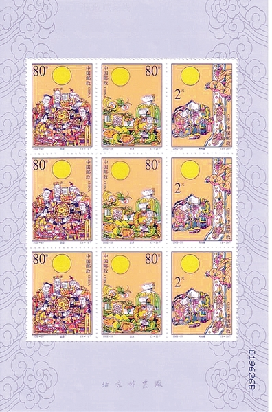2002年9月,国家邮政局发行了3枚1套的《中秋节》特种邮票,邮票名称依次为:团圆、赏月、月为媒,面值分别是80分、80分、2元,另外还发行一枚小版张,小版张发行量为180万枚?!吨星锝凇酚势辈捎米笆位硐质址?,形象地展现了中秋佳节的喜庆气氛。目前,《中秋节》邮票一套市场价仅9元,小版张价格略高,为25元每套,值得收藏爱好者多加关注。(吴伟忠)