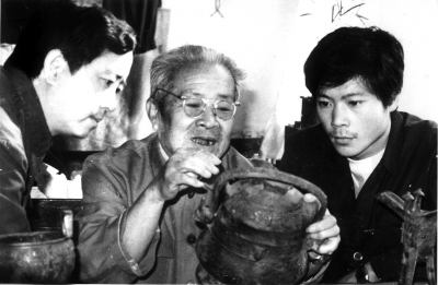 师父赵振茂(中)给王有亮(右)讲述青铜器细节。