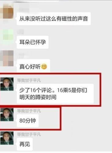 此外,另一名学生赵鹏(化名)向记者出示一个微信群的几张截图,一张截图中一个穿军装头像男子发了一张露出自己大腿的图片,然后说“你们能用美丽语言来形容一下我的腿吗?”,另一个截图中,该男子说,“少了16个评论,16乘5是你们明天蹲姿时间,80分钟,再见?!闭耘羲担媚凶泳褪亲芙坦?,他让大家夸自己的腿,夸得好可以免受体罚,夸得不好就直接体罚。