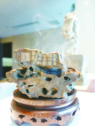 宋人赵希鹄的《洞天清禄》中记载:“东坡小有洞天石。石下作一座子,座中藏香炉,引数窍正对岩岫间,每焚香则烟云满岫。今在豫章郡山谷家,其家珍重,常与告身同置一匣”(告身:委任官职的文凭)。苏轼到底是名人,连他的玩,都被世人传颂。这个名为“小有洞天”的观赏石,经东坡居士独出机杼的打造,把只有观赏功能的供石,变成了有入鼻、入心功能的灵石香炉。玩观赏石要配置相衬的底座,苏轼将底座的内部空膛内藏香炉,同时,底座的表面上、紧贴观赏石脚底的地方,开有若干小孔。这样一来,暗藏于底座内的香炉一旦焚香起烟,便有烟丝从观赏石脚底的各个孔窍中袅袅飘出,烟云满岫。足不出户,便赏山林之气;坐拥禅室,顿感气象万千。