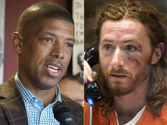 接片:萨克拉门托市市长约翰逊(左)和抗议者汤姆森。(图片来源:新华/美联)