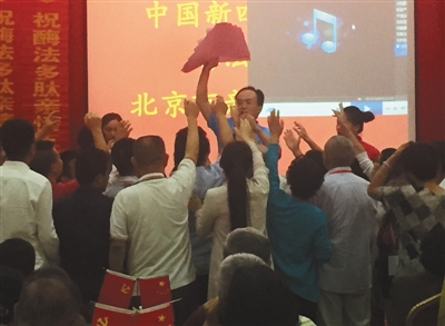 8月26日上午,房山六渡某酒店保健品会销现场,会销领队带着老人上台抢“单子”。台上“持单”教授,实为会销公司组织者。