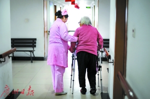 广州某老年公寓,医护人员陪老人散步。(资料图片)  广州日报记者莫伟浓 摄
