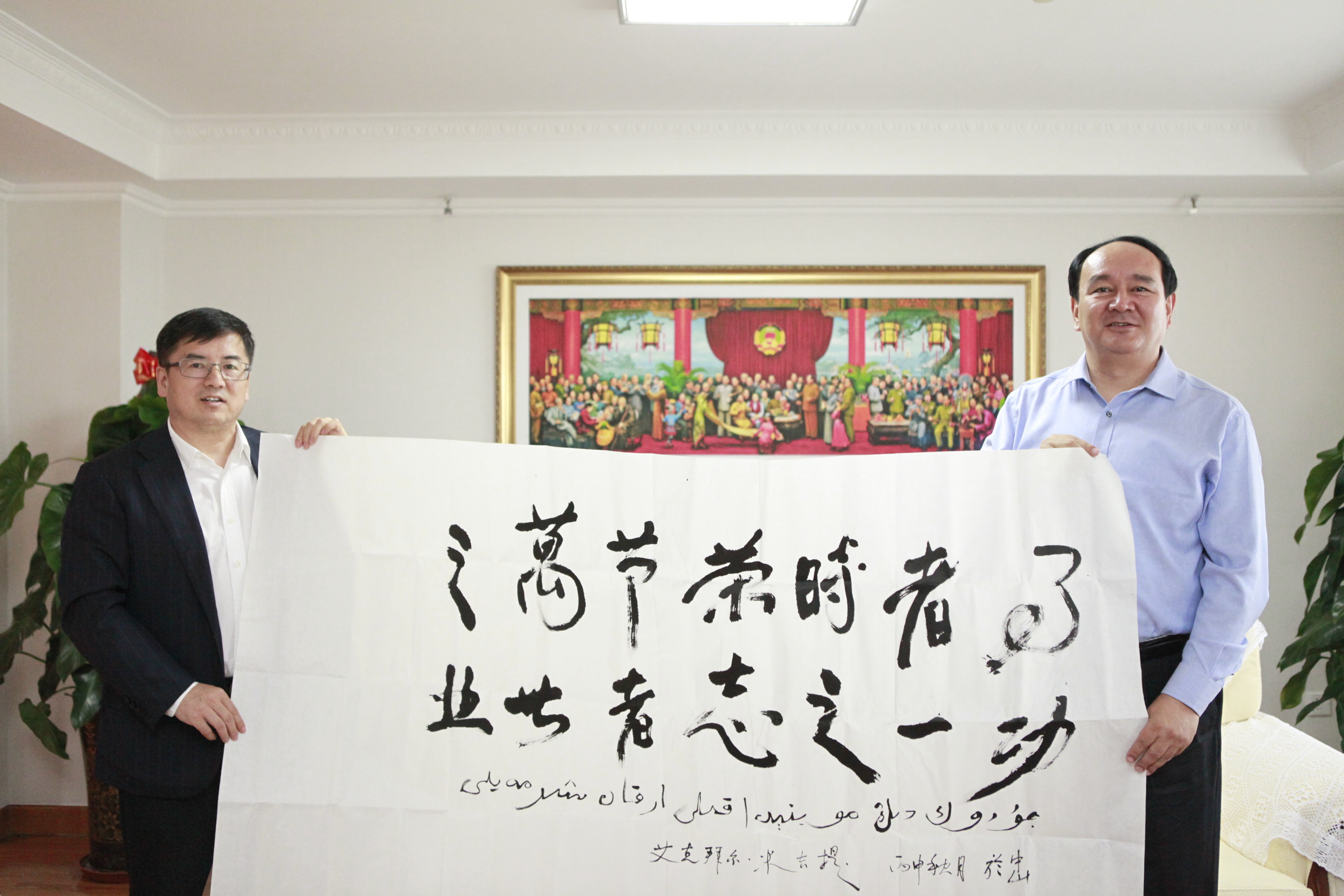 周北川代表报社向努尔兰主席赠送书法作品。