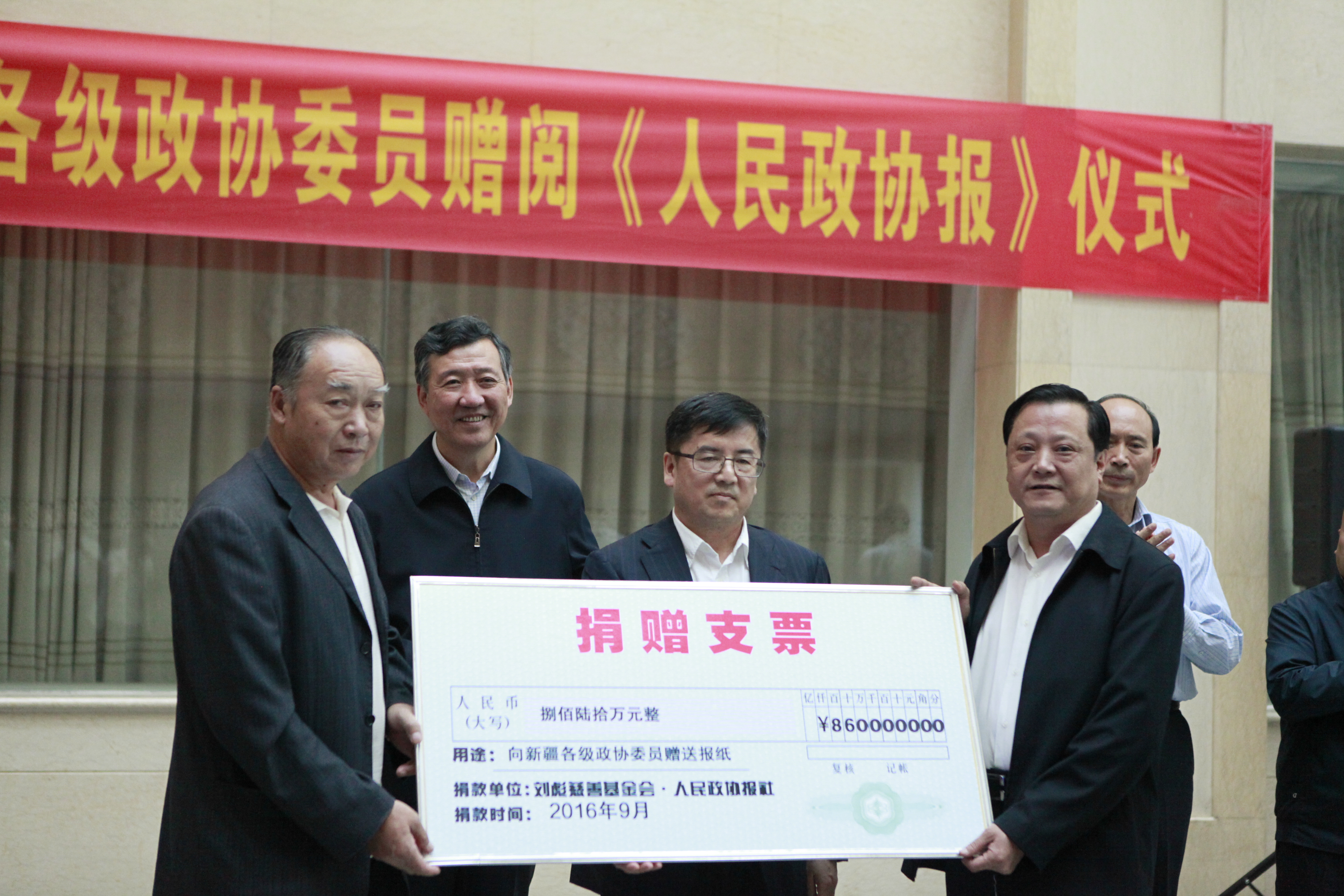 人民政协网新疆9月27日电(记者 舒迪)9月27日,人民政协报社联合刘彪慈善基金会在新疆维吾尔自治区政协举行向新疆政协委员捐赠仪式,从2016年开始将连续5年向新疆各级政协委员赠阅总计价值860万元的《人民政协报》和手机数字报。