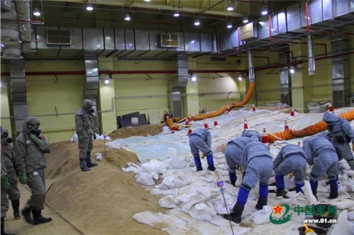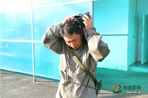 记者从弹坑中走出,脱去防毒服。周灯华 摄