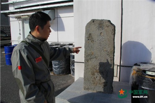 记者手指方向为“日遗毒弹埋藏处”石碑。周灯华 摄