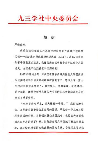9月25日,有着“天眼”之称的500米口径球面射电望远镜(FAST)在贵州省平塘县落成启用,标志着我国在科学前沿实现重大原创突破?;裣ふ庖幌惭逗?全国政协副主席、九三学社中央主席韩启德立即致信九三学社中央常委、中国科学院国家天文台台长、FAST工程项目总经理严俊,表示热烈祝贺和崇高敬意。