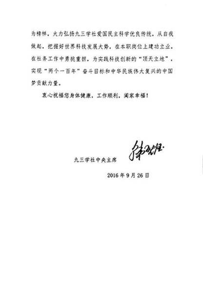 信中指出,“坐地日行八万里,巡天??匆磺Ш印!惫鄄夂棋钪?寄托着炎黄子孙矢志赶超的憧憬,承载着中华儿女建设科技强国的梦想。实施创新驱动发展战略,已经成为支撑我国未来发展的重要引擎。全社同志要以严俊为榜样,大力弘扬九三学社爱国民主科学优良传统,从自我做起,把握好世界科技发展大势,在本职岗位上建功立业,在社务工作中勇挑重担,为实践科技创新的“顶天立地”,实现“两个一百年”奋斗目标和中华民族伟大复兴的中国梦贡献力量。