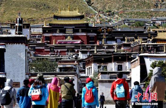 10月1日,中外游客在西藏自治区日喀则市扎什伦布寺内游览参观。中新社记者 李林 摄