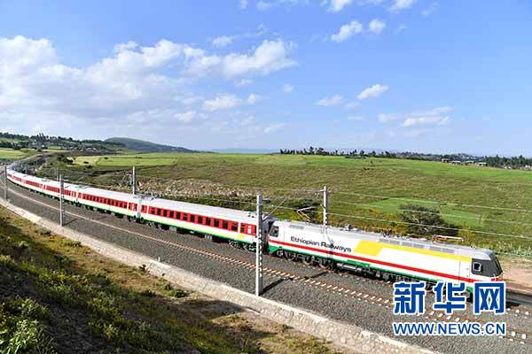 10月3日,在埃塞俄比亚首都亚的斯亚贝巴附近,一列试运行列车在亚吉铁路上行驶。新华社记者李百顺摄