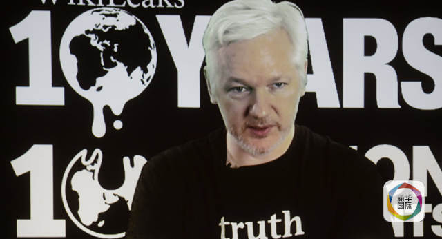 通过视频连线,阿桑奇在他避难的厄瓜多尔驻英国使馆参与在德国柏林举行的“维基揭秘”网站创建十周年庆?;疃?。他身着一件黑色T恤衫,上面印着“真相”。